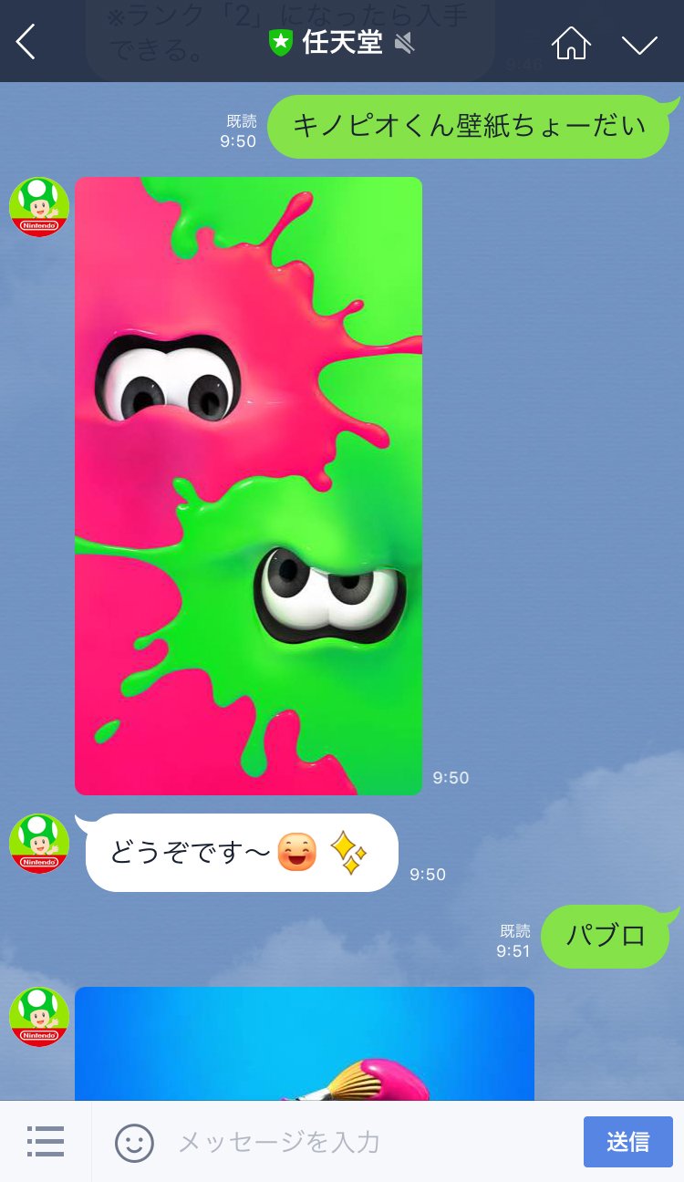 Splatoon スプラトゥーン 任天堂line公式アカウントのキノコ姿の男も 脳内がスプラトゥーン2モードになっているようだ ブキの名前を問いかければ画像を返してくれる 既に配信した限定壁紙を貰い損ねた人は キノピオくん壁紙ちょーだい と問いかけ